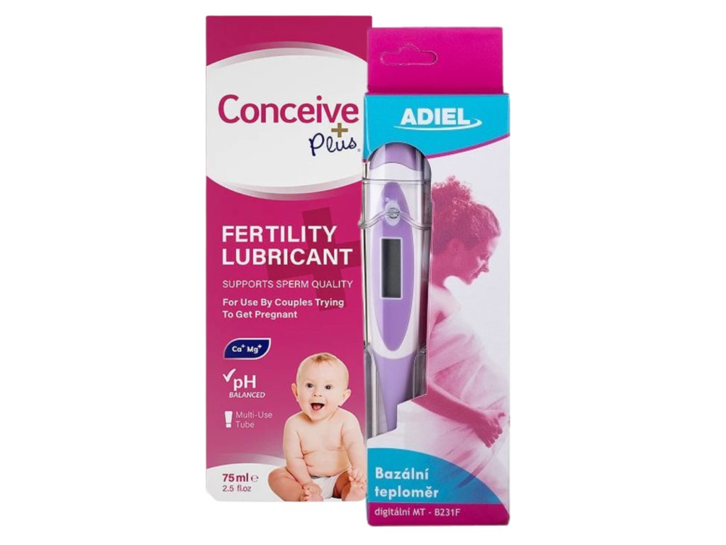 Súčasťou je bazálny teplomer, s ktorého pomocou si meriate bazálnu teplotu a dokážete tak vyhodnotiť dobu svojej ovulácie. Vysokokvalitný a bezpečný teplomer s pružnou špičkou zmeria vašu bazálnu teplotu s presnosťou na 2 desatinné miesta. Keď si overíte, kedy nastáva ovulácia, prichádza na rad lubrikačný gél na podporu počatia Conceive Plus. Ten je vyrobený patentovanou metódou tak, aby vytváral špecifické pH prostredie pre optimálne podmienky potrebné na prežívanie a migráciu spermií. Spermie v spojení s Conceive Plus preukazujú významne zlepšenú životaschopnosť v porovnaní so spermiami pohybujúcimi sa v prostredí ostatných lubrikačných gélov aj v prostredí bez použitia lubrikačných gélov.